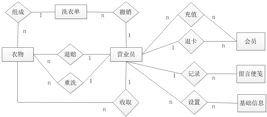 (1)收衣:营业员收取顾客的衣物,进行收衣操作,先查询出会员的信息,再进行添加衣物、删除衣物,最后产生一条收衣记录,完成收衣结单 (2)取衣:顾客来领取洗好的衣物,如果不满意,可以重洗、撤销订单或要求退赔,营业员向满意的顾客收取费用,完成取衣结单 (3)收衣取衣列表:显示所有的洗衣单与详细信息 (4)返回重洗记录:显示近期内的返回重洗记录 (5)撤销洗衣单记录:显示近期内的撤销订单记录 (6)退赔衣物记录:显示近期内的索赔衣物记录
