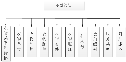(1)衣物类型和价格:设置衣物种类及其默认的洗衣单价 (2)衣物单位:设置条、件、只、套等单位 (3)衣物品牌:设置常见品牌,如阿迪达斯、波司豋、鄂尔多斯、雅戈尔等 (4)衣物颜色:设置颜色,如黑色、粉红色、橙色等 (5)衣物附件:设置衣物附件,如帽子、皮带等 (6)衣物瑕疵:设置衣物瑕疵类型,如掉色、发黄、划痕、墨渍等 (7)挂衣号:设置挂衣号码 (8)会员级别:设置会员级别及其对应的折扣 (9)服务类型:设置服务类型,如水洗、干洗、皮衣、织补、单烫等 (10)附加服务:设置附加服务,如加快、配纽扣等