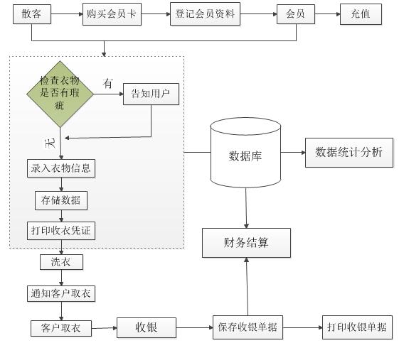 当衣物洗好后,根据已有的资料通知顾客来取衣,同时收取相应的费用,打印收据,相关数据再次流入数据库。收衣取衣是系统主要的功能,其次是会员管理。在统计中心里,主要是从数据库里获取相关信息,分析收入情况。管理员能进行系统用户管理,拥有比营业员更高的权限,完全控制整个系统。业务流程图如下: