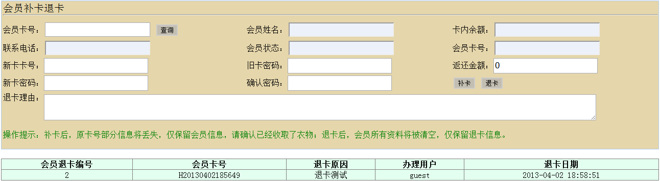 该模块主要包含会员资料、会员充值、会员补卡退卡等功能,以及对会员消费记录的查看。以会员补卡退卡为例来说明,下面是界面截图: