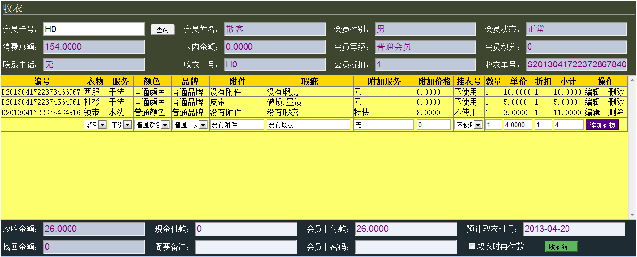 这个模块主要是收衣、取衣、撤销订单、退赔衣物、重洗衣物等操作,其余功能是为了方便查看相关信息。下面以“收衣”功能为例,界面与部分代码如下: