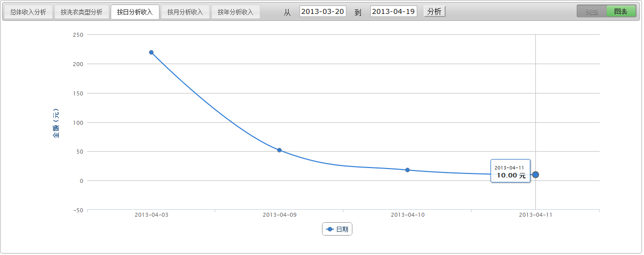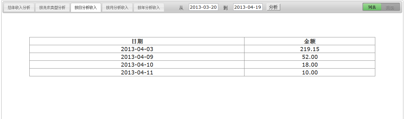基于前面的功能实现,该模块主要完成营业收入的统计,其余次要的统计信息可以在各自页面查看。主要有营业收入统计、留言薄、便笺这三个功能,下面以“营业收入统计”为例介绍,先是界面截图: