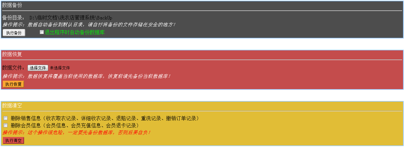 这个模块主要包括数据备份恢复、用户管理、职员交班、系统日志等功能,下面以数据备份、恢复为例进行介绍,界面截图与部分代码如下: