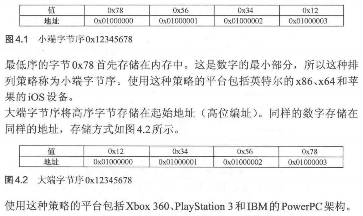 字节在一个平台上的存储顺序被称作这个平台的字节序,可以是小端字节序(little-endian)或大端字节序(big-endian)。小端字节序存储多字节数字,是将低序字节存储在起始地址(低位编址)。例如,值为 0x12345678 的整数存储在地址为 0x01000000 的内存中,存储方式如图。