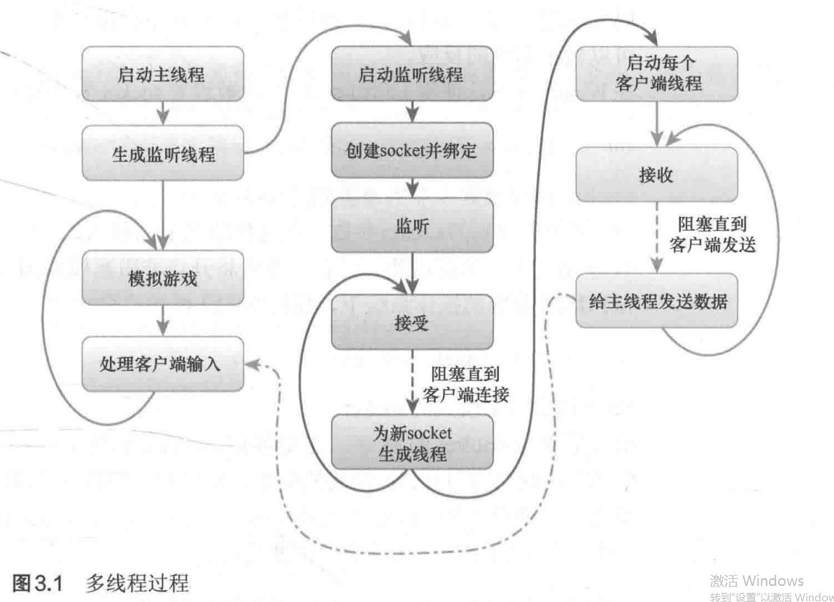 - 多线程:给每个可能阻塞的调用生成一个线程。下图展示了服务端的多线程操作。